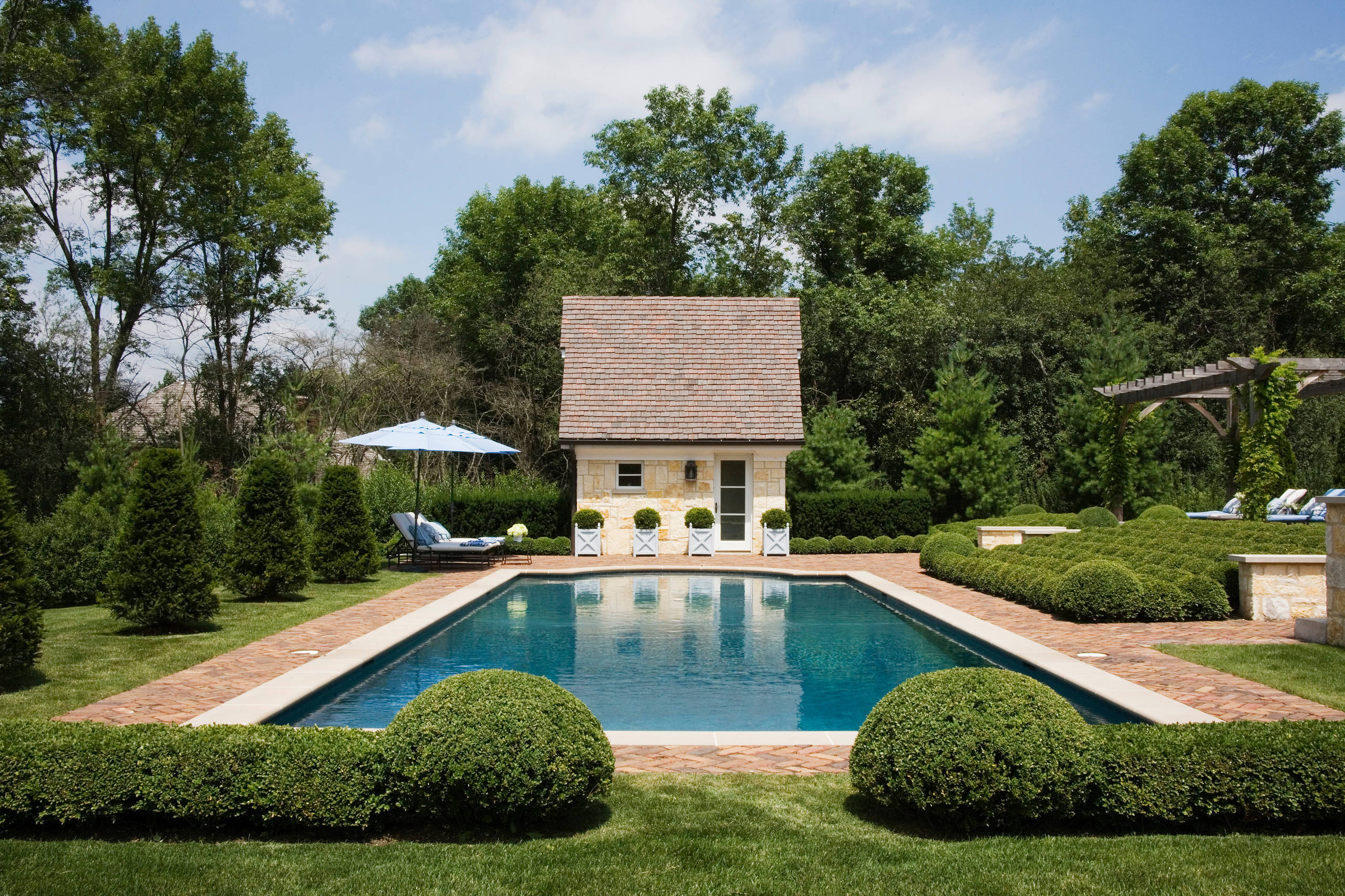Linda Oyama Bryan Huge elegant backyard brick and rectangular pool house photo in Chicago
