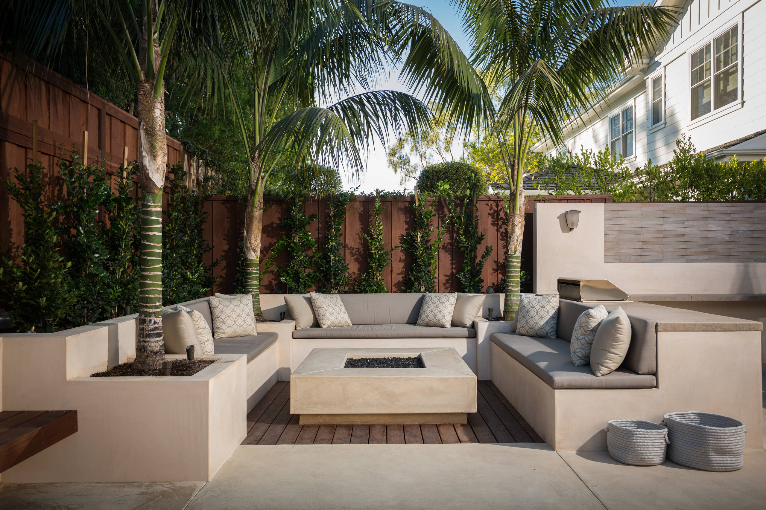 Patio - large modern backyard concrete patio idea in Orange County with a fire pit and no cover